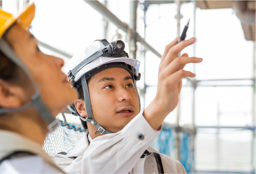 また、研修後半には、現場を見学した上でのディスカッション、危険予知を学んでのグループワークなどの実践的な研修も加わります。これらの実践的な研修をクリアするにつれて、建設エンジニアになるという実感が得られるようになり、未経験者が抱えていた不安は、好奇心や新しいことへ挑戦する意欲に変わり、安心して業務を行うことができるようになります。